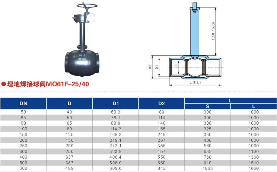 直埋式焊接球閥可以直接埋與地下,不用建高大型閥門井,只需在地面上設(shè)置小型淺井,大大節(jié)省施工費(fèi)用及工程時(shí)間??筛鶕?jù)施工及設(shè)計(jì)要求,調(diào)節(jié)閥體的長(zhǎng)短和閥桿的高度。球體的加工精度非常精密,操作輕便,無(wú)不良干涉。采用高級(jí)的原材料,能保證PN25以上的壓力。